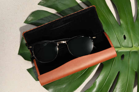 Stylish sunglasses in brown leather case and tropical leaf on sand, flat lay