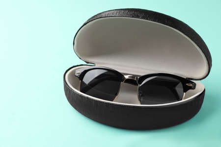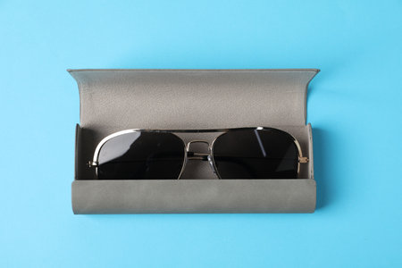 Stylish sunglasses in black leather case on light blue background