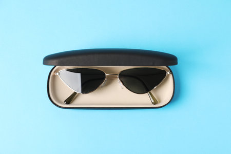 Case with stylish sunglasses on light blue background, top view