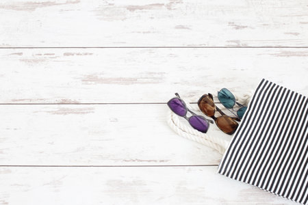beach bag and sunglasses on old painted wooden background
