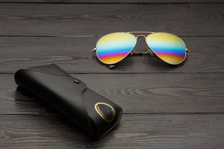 aviators sunglasses with mirrored color lenses made of glass in a gold metal frame covered with gold matte dusting on a black wooden background or table with a black leather case with a clip fastener with a gold circle and an inscription on a leather texture case