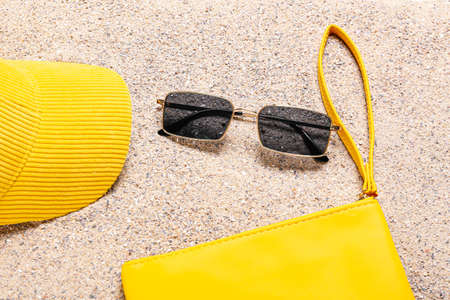 Stylish female accessories on sand