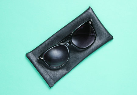 Sunglasses with protective leather case on blue background