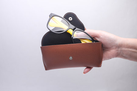 Hand holding Leather case with eyeglasses on blue background
