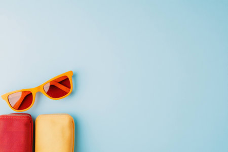 Bright summer accessories including colorful sunglasses and cases on a pastel blue background, perfect for seasonal fashion trends and vibrant lifestyle shots
