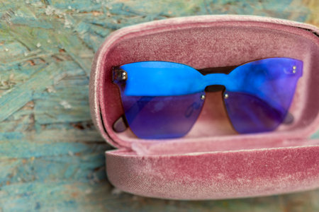 stylish sunglasses on blue wooden table with sunlight