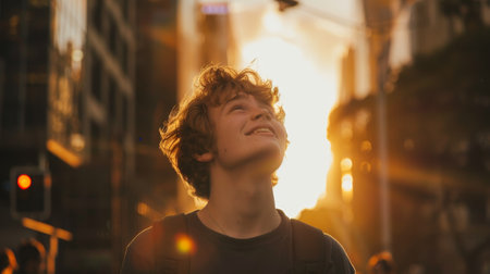 A young man with curly hair is smiling and looking up at the sun. Concept of happiness and positivity, as the man is enjoying the beautiful day
