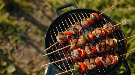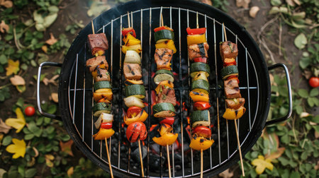 Enjoy a vibrant array of grilled meat and vegetable skewers sizzling over an open flame, perfect for outdoor gatherings or summer picnics.