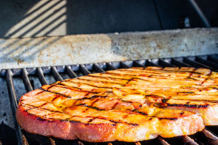 Ham steak with honey mustard glaze on the grill. Calgary, Alberta, Canada