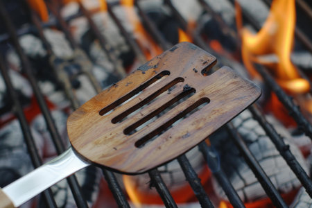 Wooden spatula with a stainless steel handle resting on a hot barbecue grill with flames