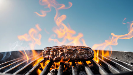 AI Generated. Juicy Grilled Beef Patty on Charcoal Grill Surrounded by Flames and Smoke for a Perfect Barbecue Experience
