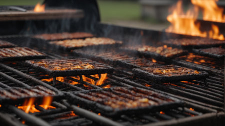 Vibrant Burning Grill with Orange Flames, Sizzling Meat, Intense Heat, and Exciting BBQ Preparation