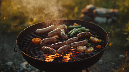 A vibrant scene of sausages and seasonal vegetables grilling over an open flame. The smoky aroma and warm colors capture the essence of outdoor cooking during summer gatherings.