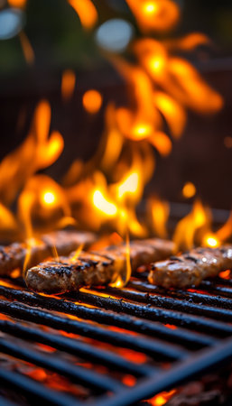 Flames flicker and rise from the hot grill grates, adding excitement to the summer barbecue. Friends enjoy food and laughter in a lively backyard setting at sunset.