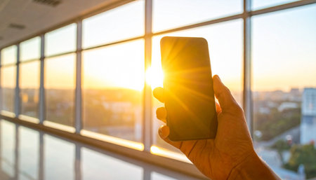 Photographing the sun at sunset on a mobile phone camera. Mobile photography. Beautiful sunset over the cities