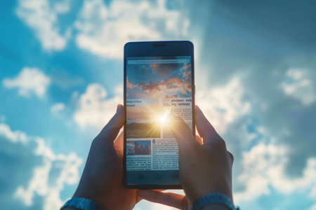 Hand holding a smartphone with a photo of the sea on the screen
