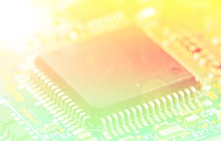 Computer Microchips and Processors on Electronic circuit board. computer hardware technology. Abstract technology microelectronics concept background. Macro shot, shallow focus.