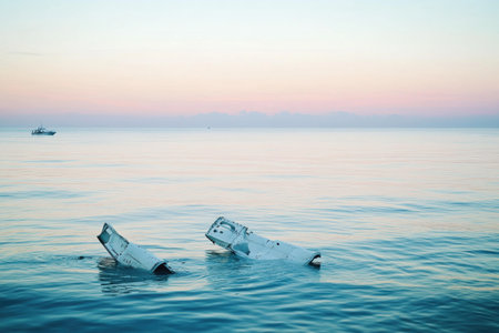 Broken parts of an aircraft drift gently in an untroubled ocean as twilight descends with soft colors and a distant vessel appears.