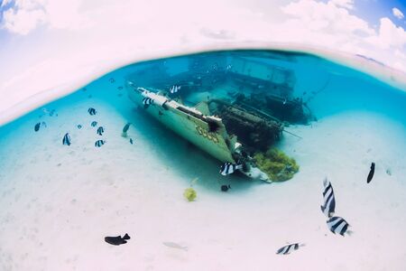 Shipwreck on the ocean floor. Underwater scenery. Tropical coral reefs.