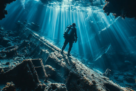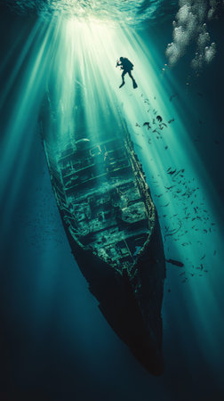 diver investigates sunken shipwreck surrounded beams light filtering blue water highlighting mystery and beauty underwater exploration.