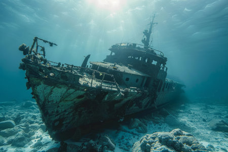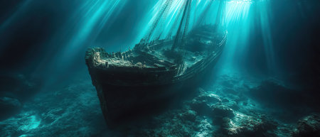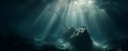 Sunken shipwreck underwater with light rays penetrating deep ocean water creating mysterious atmosphere
