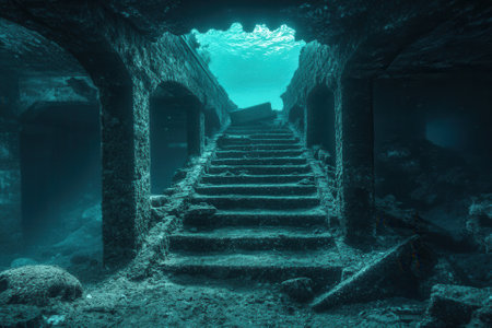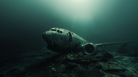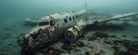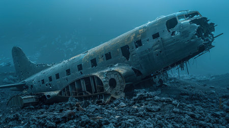 An ancient aircraft rests on the ocean floor, cloaked in marine mysteries.