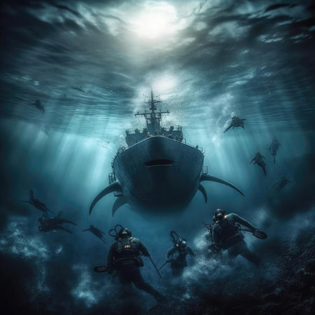 Exploring a sunken submarine with a robotic diver in deep ocean waters Generative AI