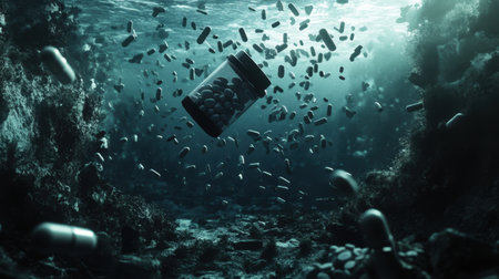 A mysterious deep-sea setting where a pill bottle hovers motionlessly, its pills drifting weightlessly around it.