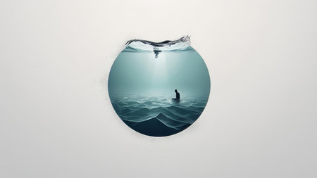 A surprised businessman in a suit underwater surrounded by fish, presenting a unique and creative concept.