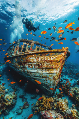 A diver examines an old boat wreck resting on the ocean floor, surrounded by vibrant coral reefs. Small, colorful fish swim around the decaying vessel, showcasing the beauty of underwater ecosystems in a tropical location.
