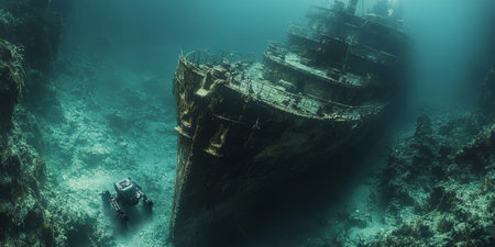 Exploring a shipwreck with a robotic submarine in deep ocean waters Generative AI