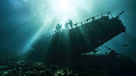 Silhouetted divers explore a sunken ship, bathed in ethereal sunlight