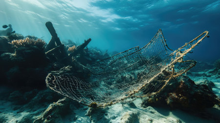 Haunting underwater view of coral reef destroyed by entangled, abandoned fishing net