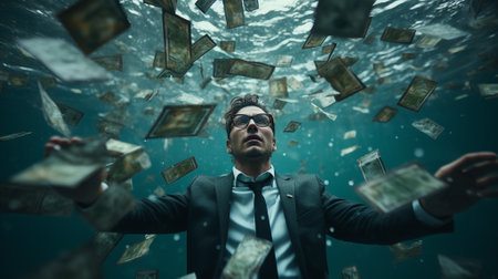 A man dressed in formal attire swims through a clear pool filled with stacked money, creating a surreal atmosphere.