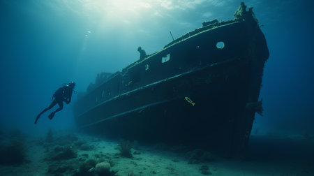 A diver hovering over a shipwreck, with the rusted remains creating an eerie yet fascinating backdrop.