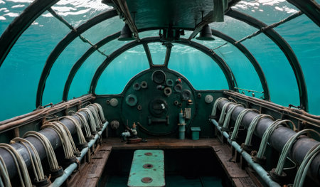 Bright blue waters surround an old submarine's cockpit, showcasing worn controls and long ropes. This unique vessel invites adventure seekers to explore marine wonders and hidden treasures.