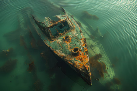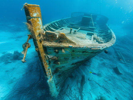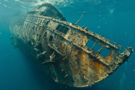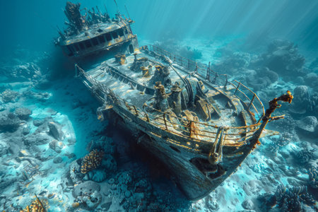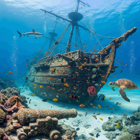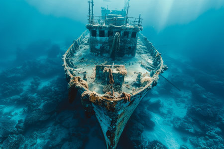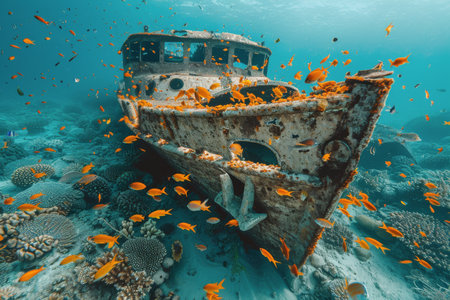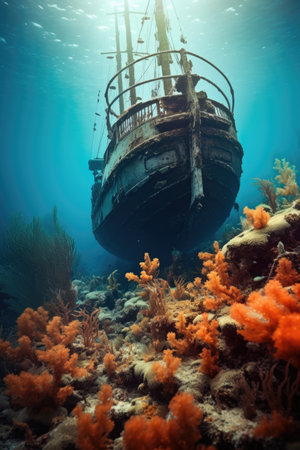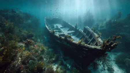 A hauntingly beautiful shipwreck lies submerged, encrusted with colorful corals and teeming with aquatic ecosystems. This underwater scene captures the serenity and mystery of the ocean depths.