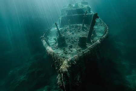 Sunken shipwreck underwater with light rays penetrating deep ocean water creating mysterious atmosphere
