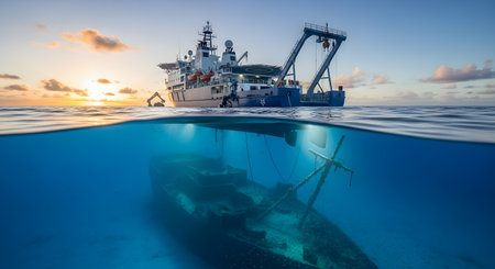 A dramatic over-under, split-level photograph shows a marine research vessel on the ocean surface at sunset, while directly below, a sunken shipwreck rests on the sandy seabed. The image powerfully illustrates the process of marine archaeology and underwater exploration.
