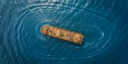 An abandoned shipwreck lies submerged in clear blue water, surrounded by ripples. The remnants of the vessel tell a story of time and decay, showcasing nature's reclamation.