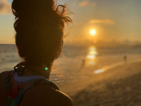 Young girl watching the sunset at Barra da Tijuca beach in Rio de Janeiro, Brazil. Sea with calm waves.