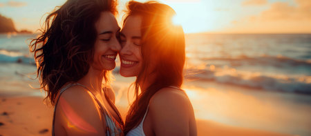 A young woman with glasses laughing joyfully during sunset with friends at beach, warm light and happy mood