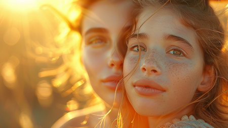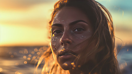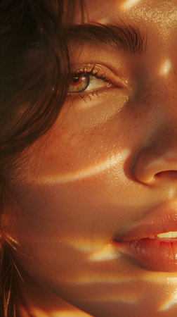A close-up shot of a woman with striking features, bathed in warm sunlight, showcasing her glowing skin.