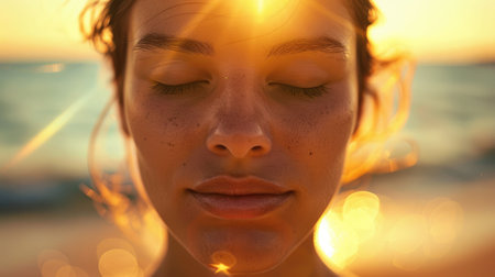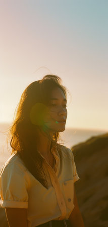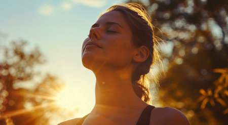 A young woman basks in the warmth of setting sun eyes closed savoring tranquility of nature.