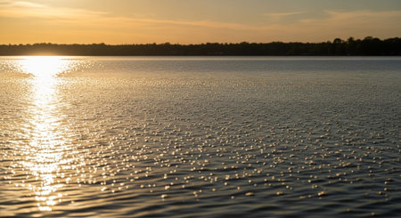 Serene sunset over lake waters reflecting golden sunlight rays