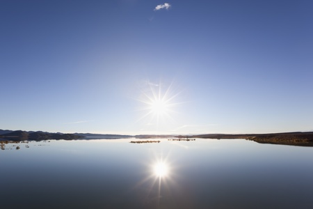 A stunning sunset over a calm lake, with the golden sun reflecting off the water and casting a warm glow across the sky.