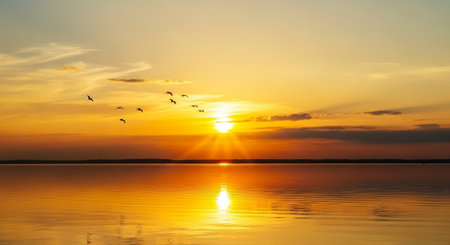 Sunset over the lake with seagulls flying in the sky