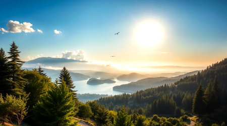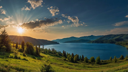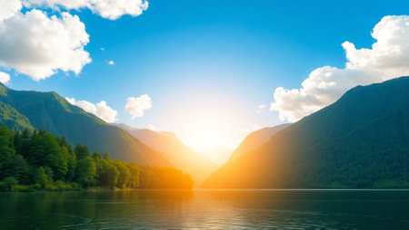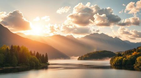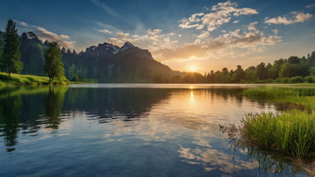 Picturesque mountain lake scene with golden sunset glow