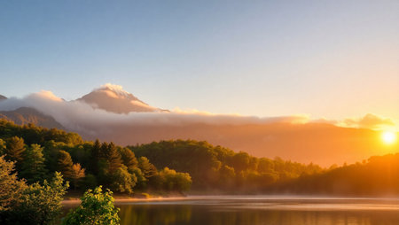 Tranquil lakeside sunrise with misty reflections on calm water