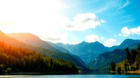 Mountain landscape with lake and forest at sunset. Beautiful nature scene.